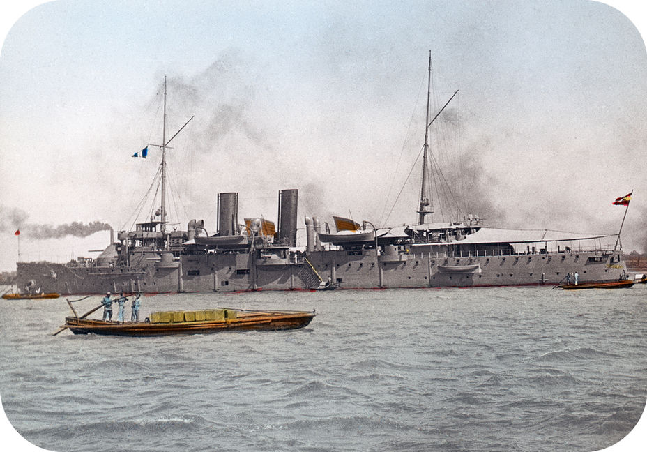 裏面灰色外牆的佛寺。英國巡洋艦,魚雷艇和蒸汽駁船在
